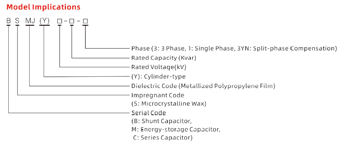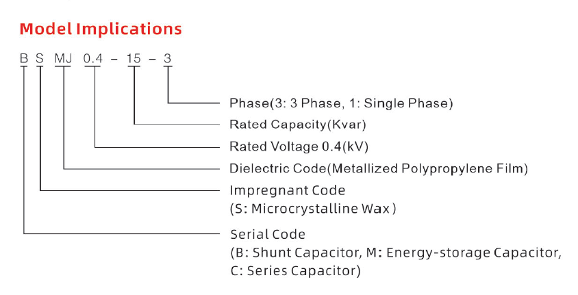 ตัวอักษรตัวแรก B หมายถึง "ตัวเก็บประจุแบบแบ่ง" ซึ่งบ่งชี้ว่าตัวเก็บประจุเชื่อมต่อแบบขนานในระบบไฟฟ้า โดยหลักๆ แล้วใช้เพื่อชดเชยพลังงานรีแอกทีฟ ตัวอักษรตัวที่สอง S ระบุว่าตัวกลางในการชุบคือ "ขี้ผึ้งพาราฟิน" หรือ "ขี้ผึ้งไมโครคริสตัลไลน์" ซึ่งเป็นสารทำให้มีความเสถียรและเป็นมิตรกับสิ่งแวดล้อมซึ่งช่วยปรับปรุงประสิทธิภาพการทนต่อแรงดันไฟฟ้าและการกระจายความร้อนของตัวเก็บประจุได้อย่างมีประสิทธิภาพ และตัวอักษรตัวที่สามและตัวถัดมา MJ แสดงถึง "ฟิล์มโพลีโพรพีลีนที่เคลือบด้วยโลหะ" ซึ่งเป็นวัสดุสำคัญสำหรับไดอิเล็กตริกระหว่างอิเล็กโทรดของตัวเก็บประจุ ซึ่งมีคุณสมบัติการรักษาตัวเองและคืนสภาพฉนวนโดยอัตโนมัติเมื่อเกิดการพังทลายเฉพาะที่